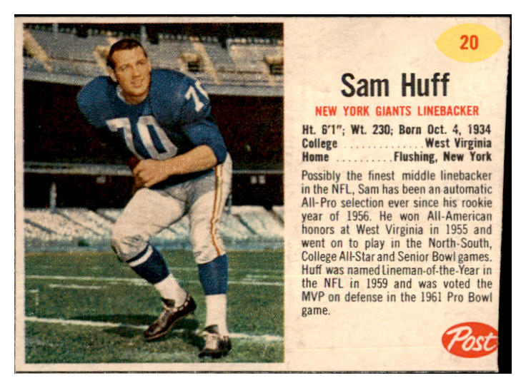 1962 Post Football #020 Sam Huff Giants NR-MT 529345