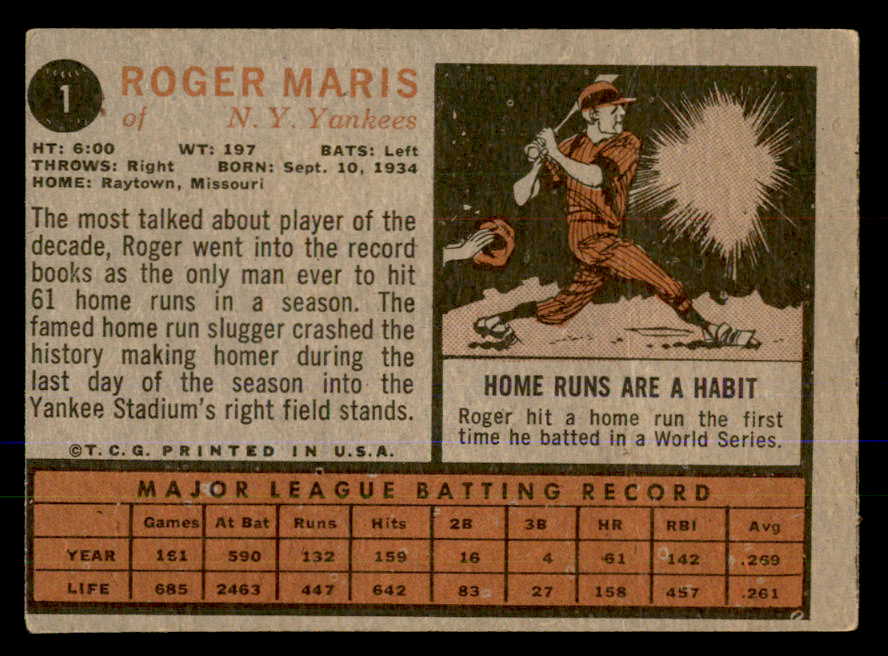 1962 Topps Baseball #001 Roger Maris Yankees VG 547793