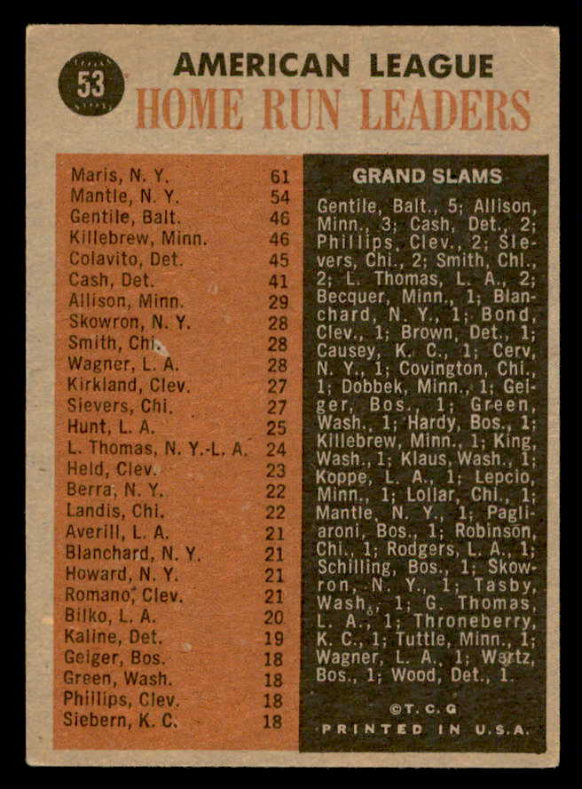1962 Topps Baseball #053 A.L. Home Run Leaders Mickey Mantle EX+/EX-MT 540538