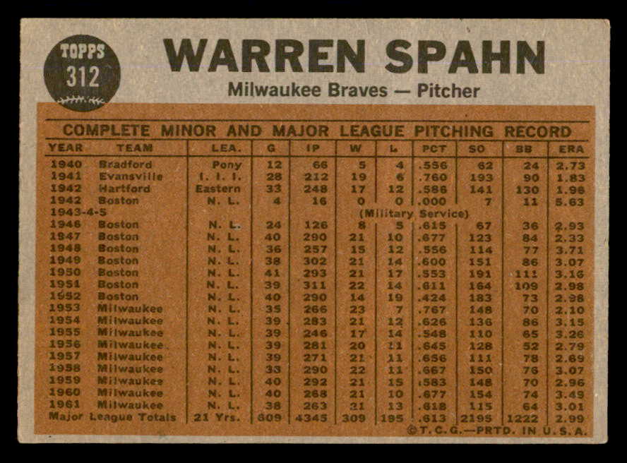 1962 Topps Baseball #312 Warren Spahn IA Braves EX+/EX-MT 540517