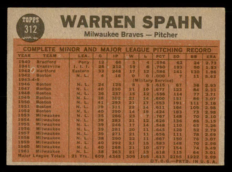 1962 Topps Baseball #312 Warren Spahn IA Braves EX-MT 539655