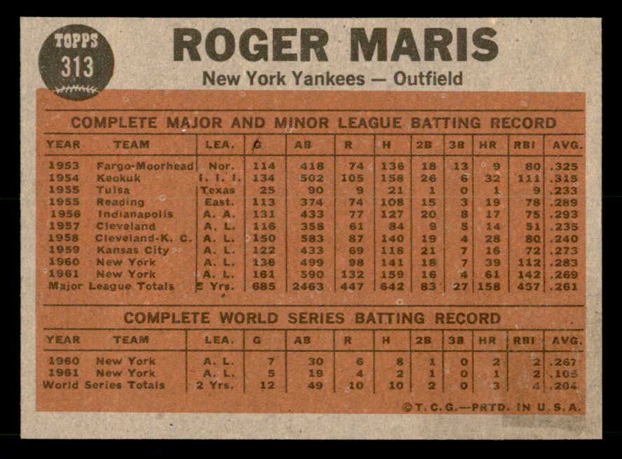 1962 Topps Baseball #313 Roger Maris IA Yankees EX-MT 539650