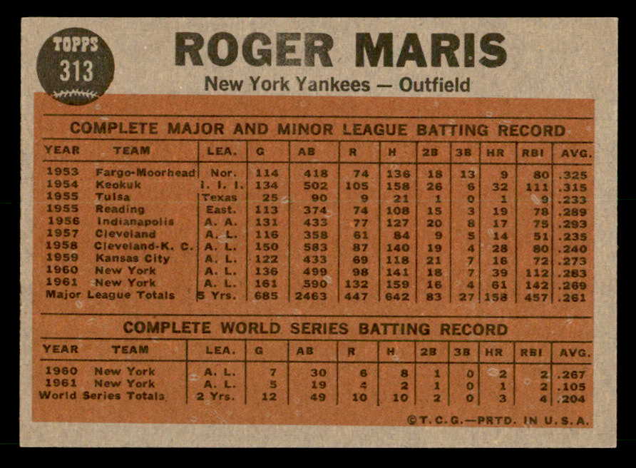 1962 Topps Baseball #313 Roger Maris IA Yankees EX-MT 539651