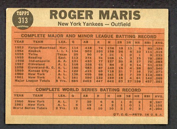 1962 Topps Baseball #313 Roger Maris IA Yankees EX-MT 539652