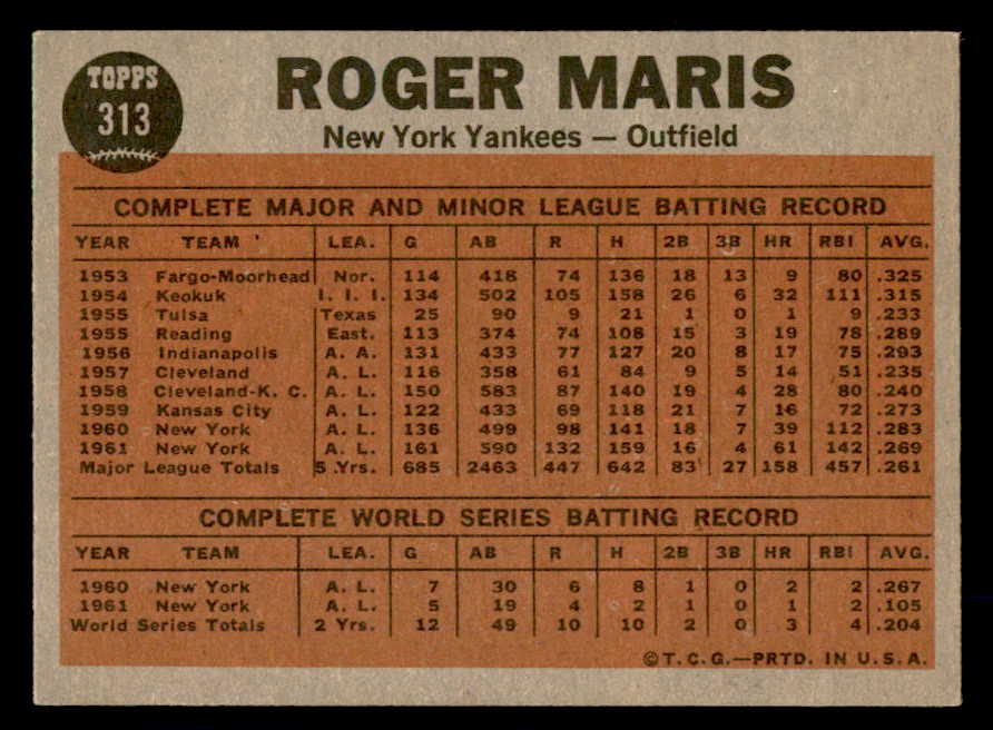 1962 Topps Baseball #313 Roger Maris IA Yankees VG-EX 540543