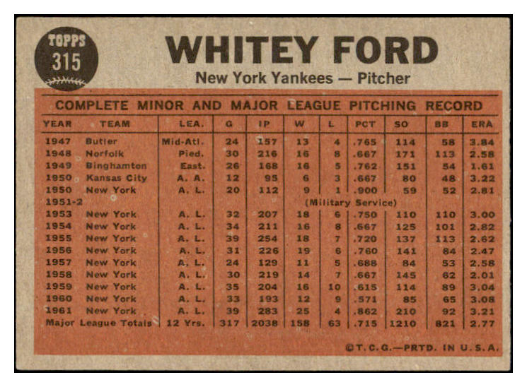 1962 Topps Baseball #315 Whitey Ford IA Yankees EX 522639