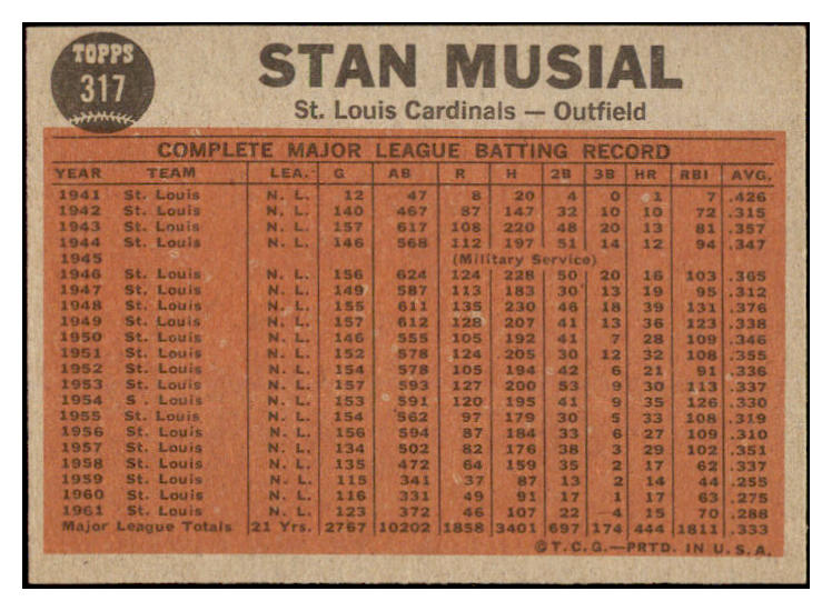 1962 Topps Baseball #317 Stan Musial IA Cardinals EX-MT 529144
