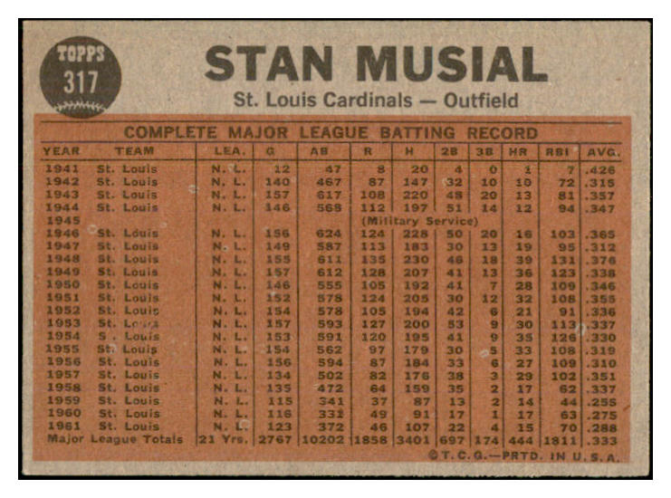 1962 Topps Baseball #317 Stan Musial IA Cardinals EX-MT 534466