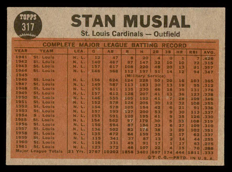1962 Topps Baseball #317 Stan Musial IA Cardinals EX-MT 539636