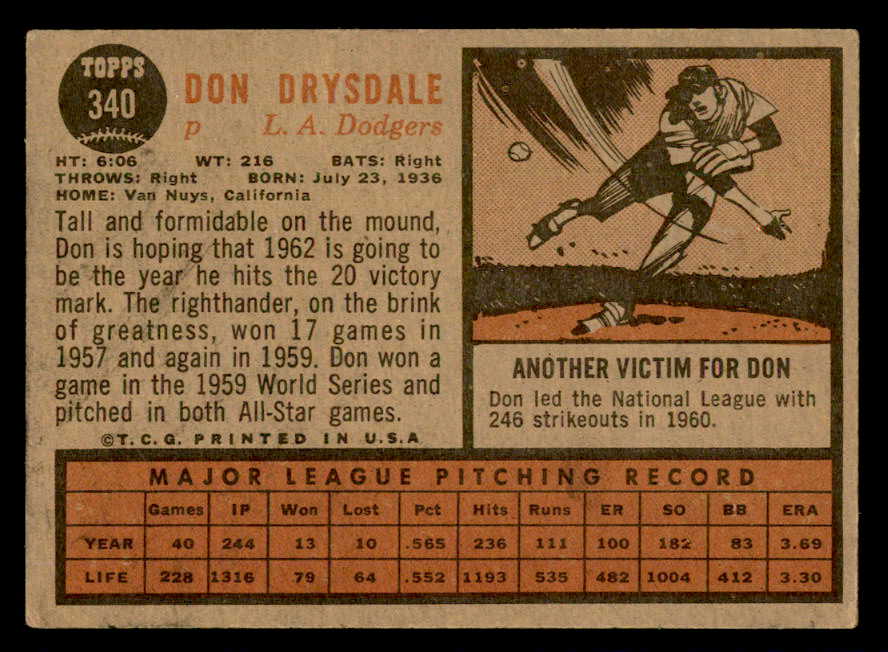 1962 Topps Baseball #340 Don Drysdale Dodgers VG-EX 540481
