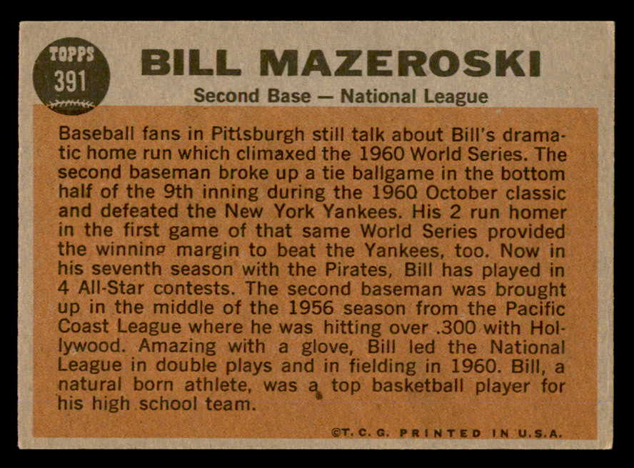 1962 Topps Baseball #391 Bill Mazeroski A.S. Pirates EX 540449