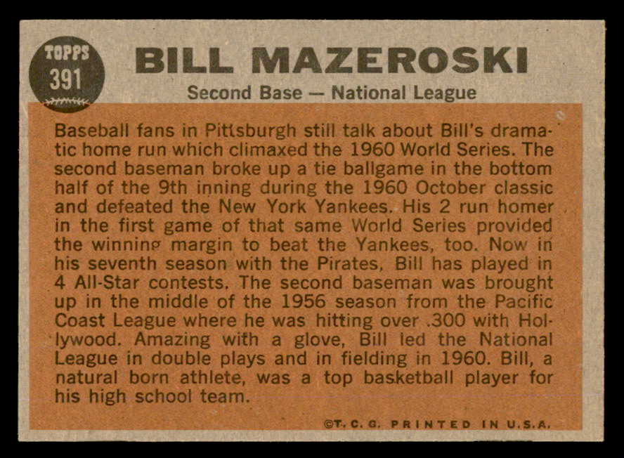 1962 Topps Baseball #391 Bill Mazeroski A.S. Pirates NR-MT 540450