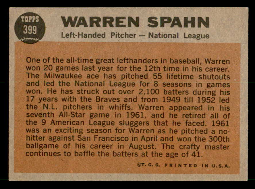 1962 Topps Baseball #399 Warren Spahn A.S. Braves EX-MT 539629