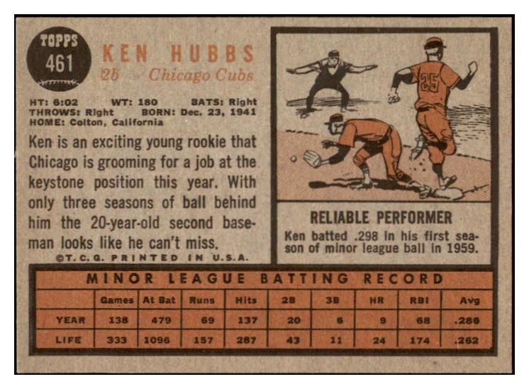 1962 Topps Baseball #461 Ken Hubbs Cubs EX-MT 530990