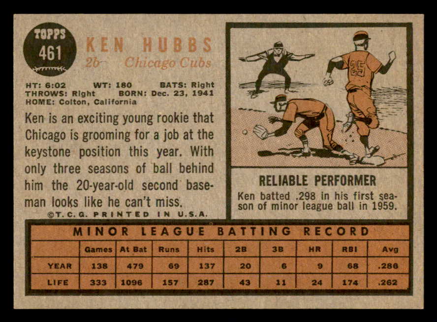 1962 Topps Baseball #461 Ken Hubbs Cubs NR-MT 540446