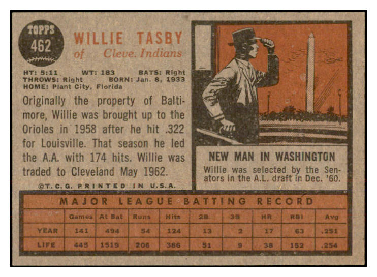 1962 Topps Baseball #462 Willie Tasby Indians EX-MT No Emblem 534320