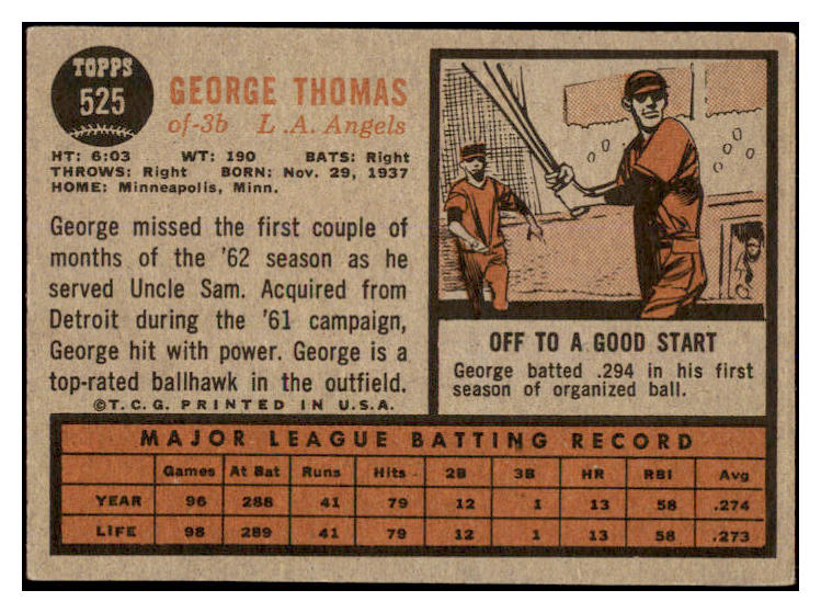 1962 Topps Baseball #525 George Thomas Angels VG-EX 527708