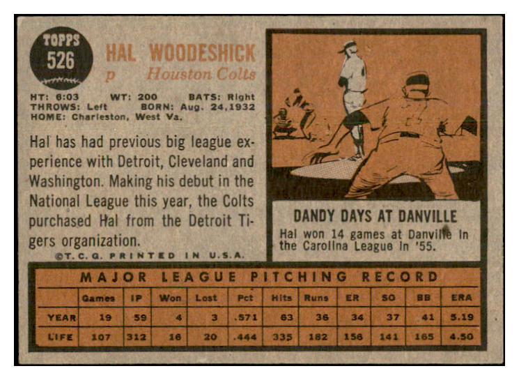 1962 Topps Baseball #526 Hal Woodeshick Colt .45s EX-MT 534196
