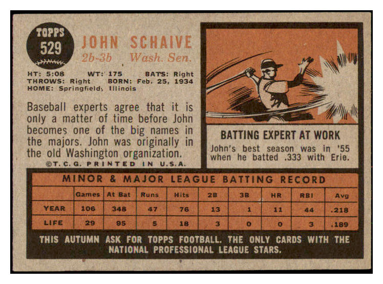 1962 Topps Baseball #529 John Schaive Senators EX-MT 531069