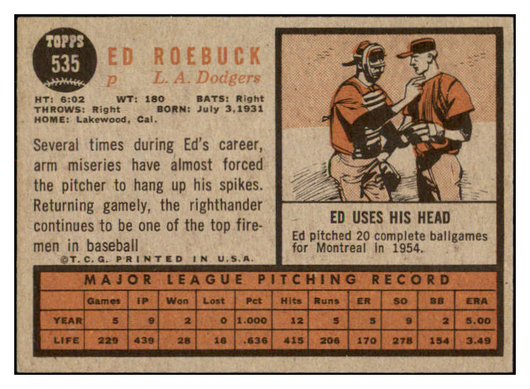 1962 Topps Baseball #535 Ed Roebuck Dodgers EX-MT 531089