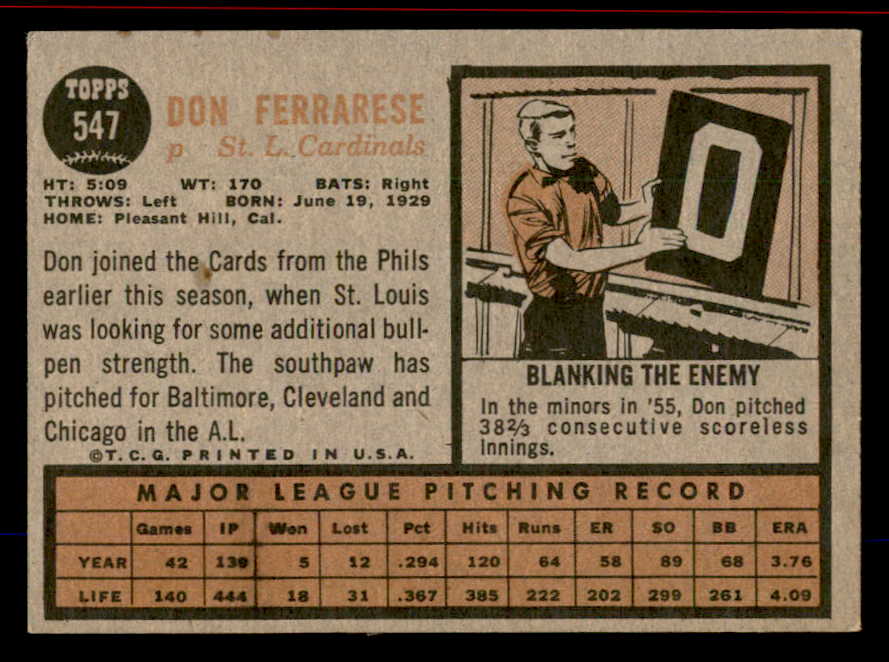 1962 Topps Baseball #547 Don Ferrarese Cardinals EX-MT 542822