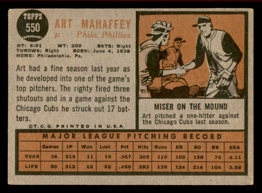 1962 Topps Baseball #550 Art Mahaffey Phillies VG-EX 542853