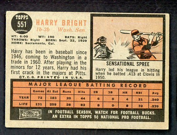 1962 Topps Baseball #551 Harry Bright Senators VG 534181
