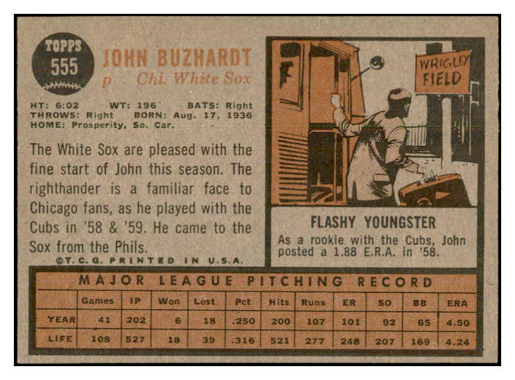 1962 Topps Baseball #555 John Buzhardt White Sox EX-MT 534205