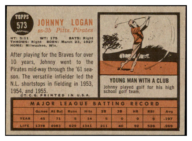 1962 Topps Baseball #573 Johnny Logan Pirates NR-MT 531108