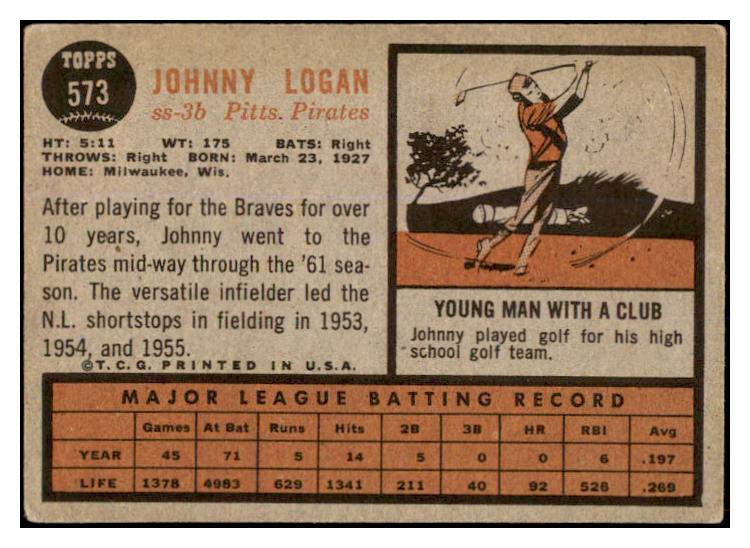 1962 Topps Baseball #573 Johnny Logan Pirates VG-EX 527713