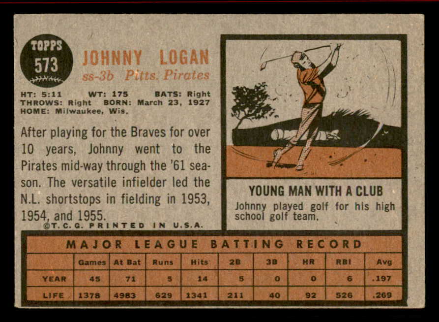 1962 Topps Baseball #573 Johnny Logan Pirates VG-EX 542863