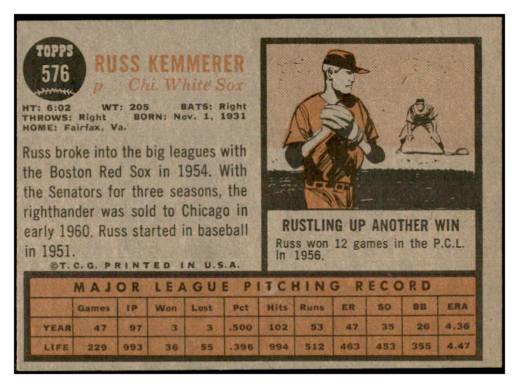 1962 Topps Baseball #576 Russ Kemmerer White Sox EX-MT 534218
