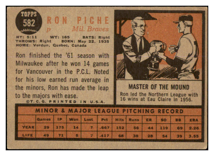 1962 Topps Baseball #582 Ron Piche Braves VG-EX 527711