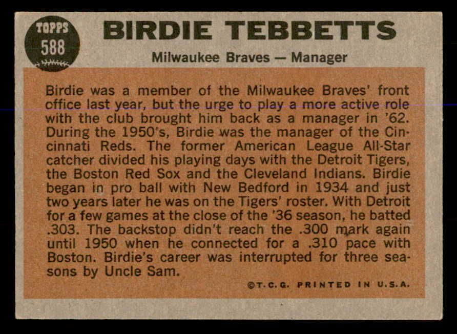 1962 Topps Baseball #588 Birdie Tebbetts Braves VG-EX 548014