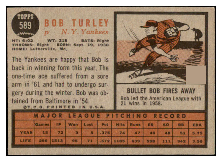 1962 Topps Baseball #589 Bob Turley Yankees VG-EX 527754