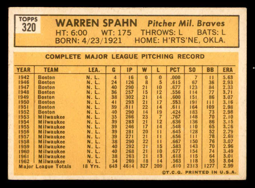 1963 Topps Baseball #320 Warren Spahn Braves VG-EX 544592
