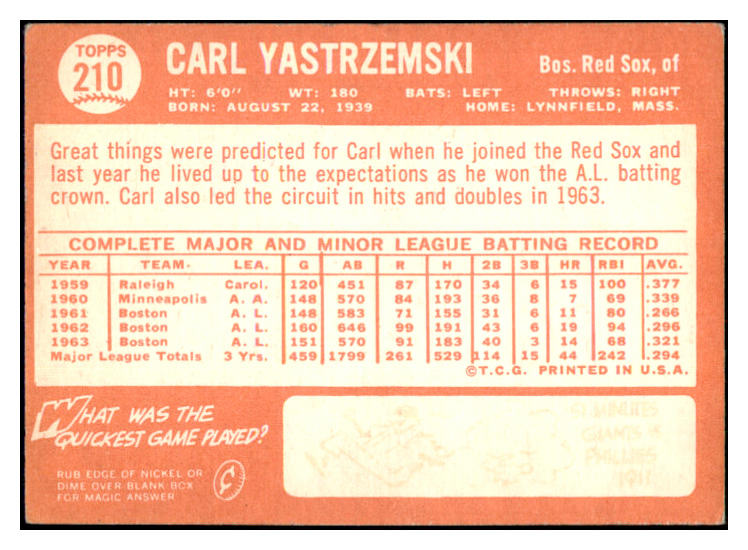 1964 Topps Baseball #210 Carl Yastrzemski Red Sox EX 531136