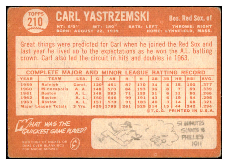 1964 Topps Baseball #210 Carl Yastrzemski Red Sox GD-VG 525617