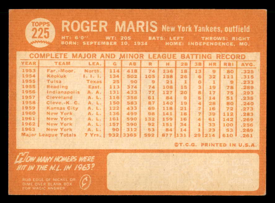 1964 Topps Baseball #225 Roger Maris Yankees EX-MT 539709