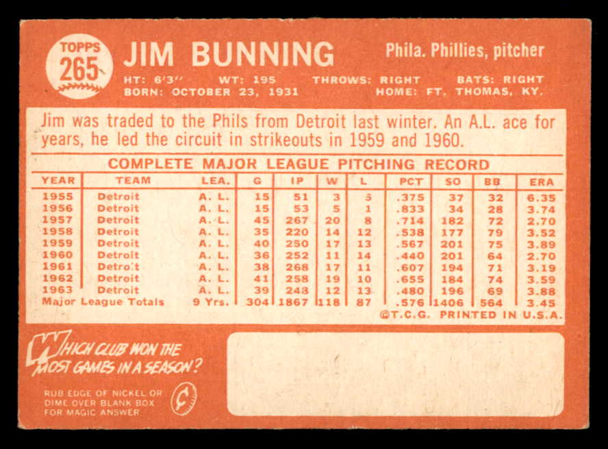 1964 Topps Baseball #265 Jim Bunning Phillies EX+/EX-MT 540683