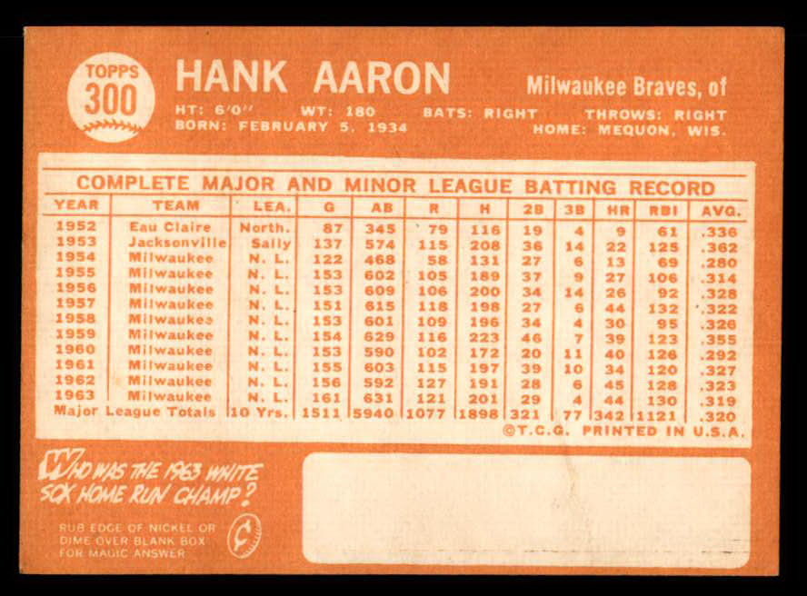 1964 Topps Baseball #300 Hank Aaron Braves EX-MT 539708