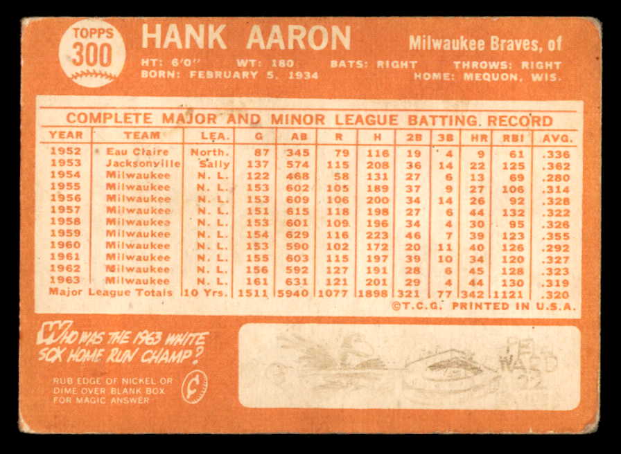 1964 Topps Baseball #300 Hank Aaron Braves VG 540709
