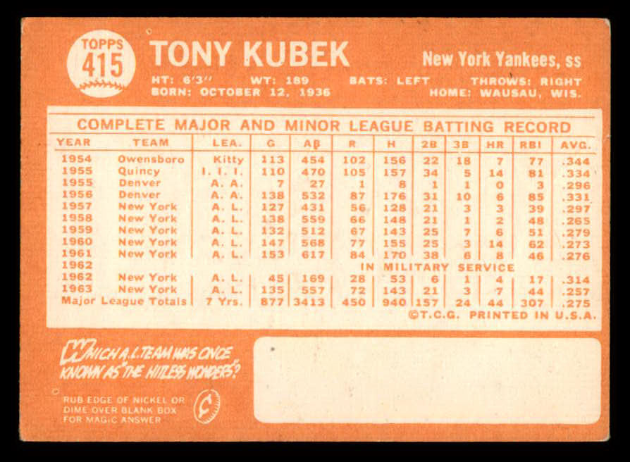 1964 Topps Baseball #415 Tony Kubek Yankees VG-EX 540675