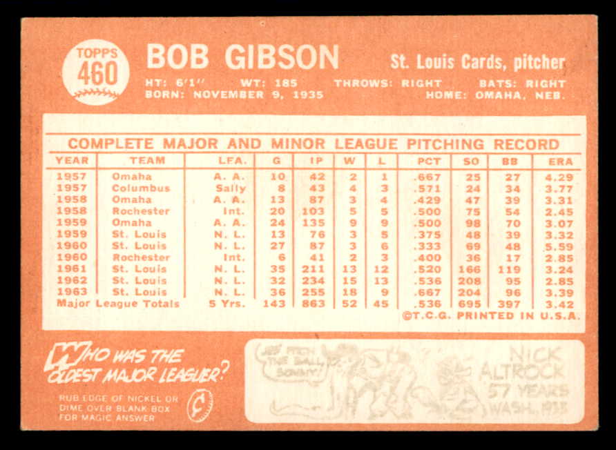 1964 Topps Baseball #460 Bob Gibson Cardinals VG-EX 540755