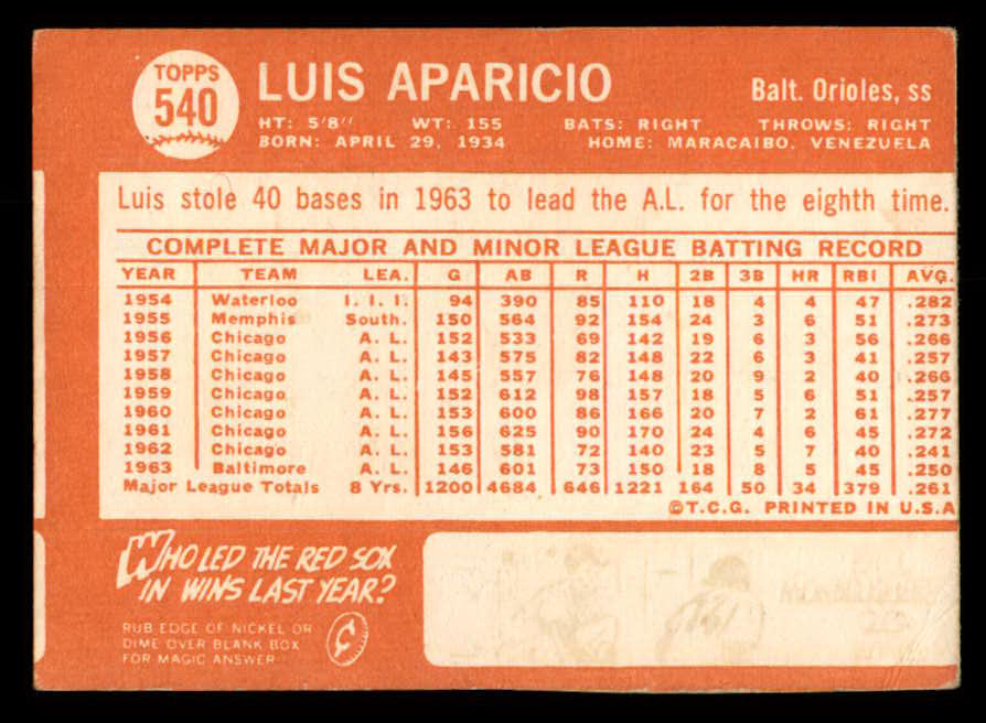 1964 Topps Baseball #540 Luis Aparicio White Sox VG-EX 540742