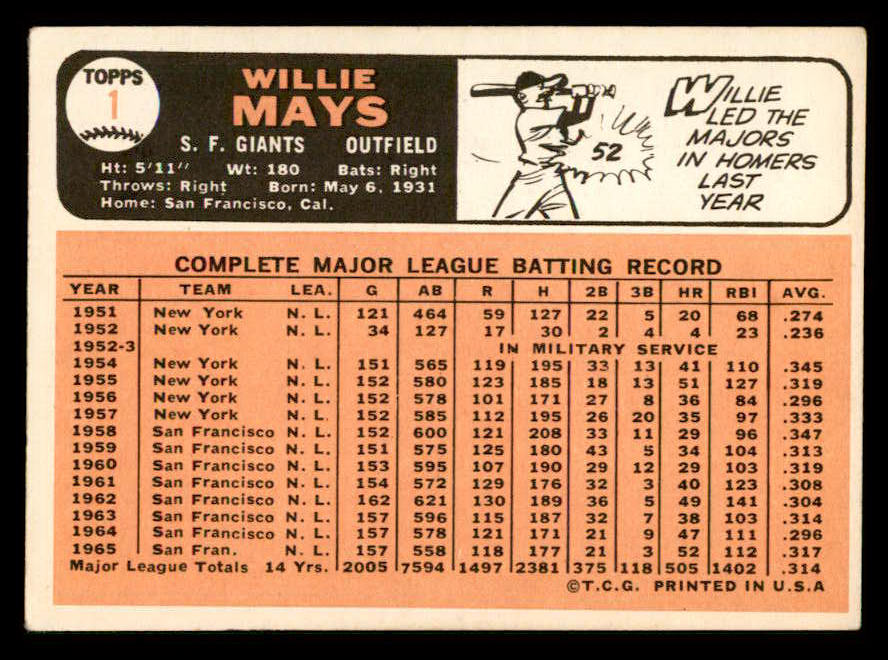 1966 Topps Baseball #001 Willie Mays Giants VG 541755