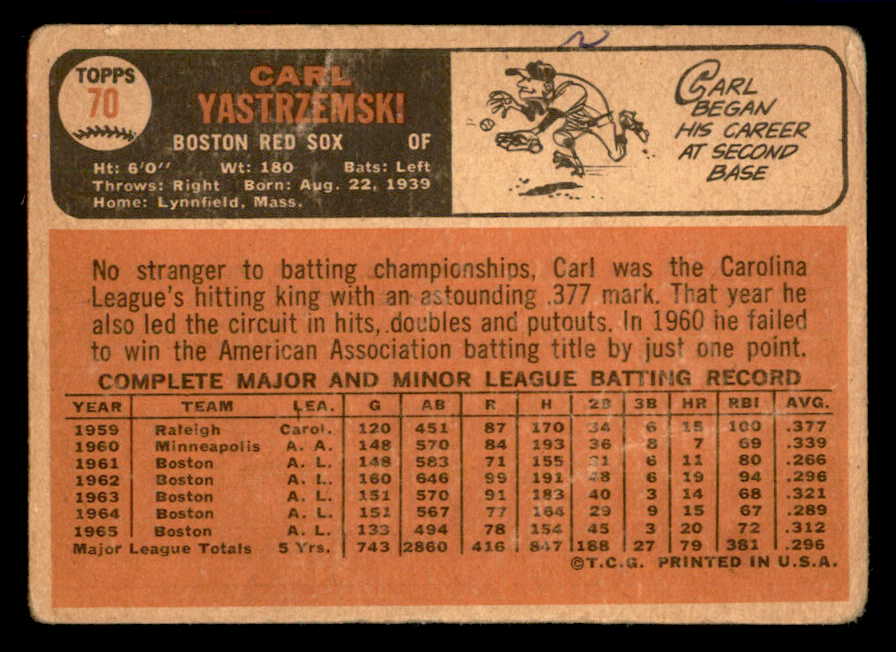 1966 Topps Baseball #070 Carl Yastrzemski Red Sox VG 540850