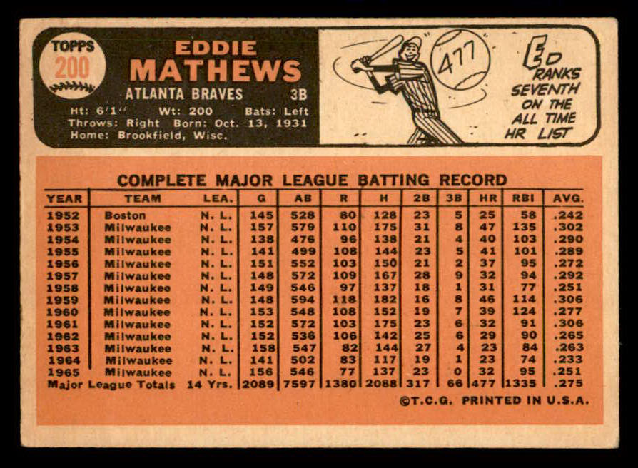 1966 Topps Baseball #200 Eddie Mathews Braves VG-EX 540910