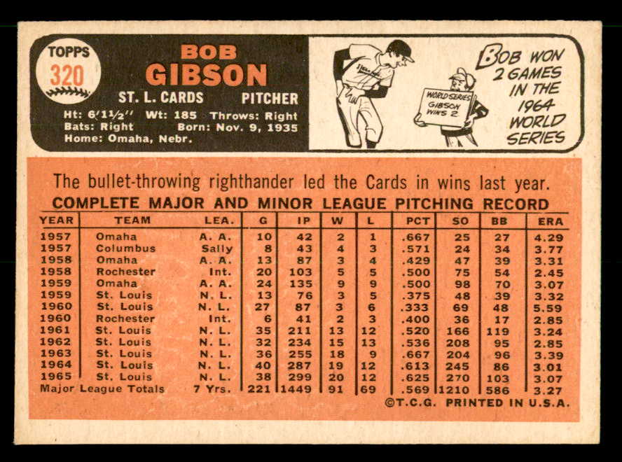 1966 Topps Baseball #320 Bob Gibson Cardinals EX-MT 539769