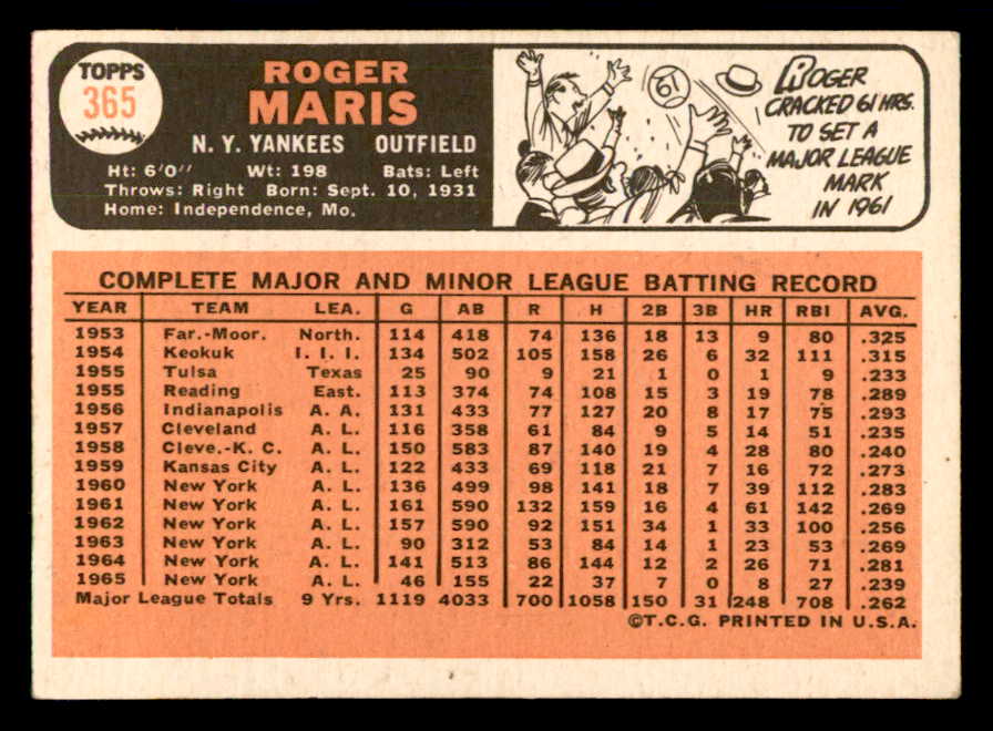 1966 Topps Baseball #365 Roger Maris Yankees VG 540907